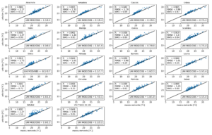 Furthermore, a validation exercise was performed, using existing networks of local measurement stations that were available in both demonstration cities. The UrbClim results were compared to daily mean temperatures and daily maximum apparent temperatures from measurements for the summer of 2022. The model was capable of reproducing observed values with small biases and good error statistics, certainly giving the fact that most of these stations were in non-optimal measurement locations and used non-professional equipment (e.g. no automatic ventilation). So the model results are found to correctly represent the local air temperature and humidity conditions in both demonstration cities.