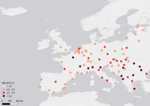 The UrbClim model has been applied before in a pan-European context, providing detailed urban climate data for a 10-year historical period for 100 cities in Europe, in the framework of the Copernicus Health contract for the C3S data platform. The data have also been used to work out an Urban Heat Island indicator for the European Environmental Agency’s Urban Adaptation Map viewer. These results have been validated with 67 meteorological measurement stations across Europe, yielding excellent error statistics.