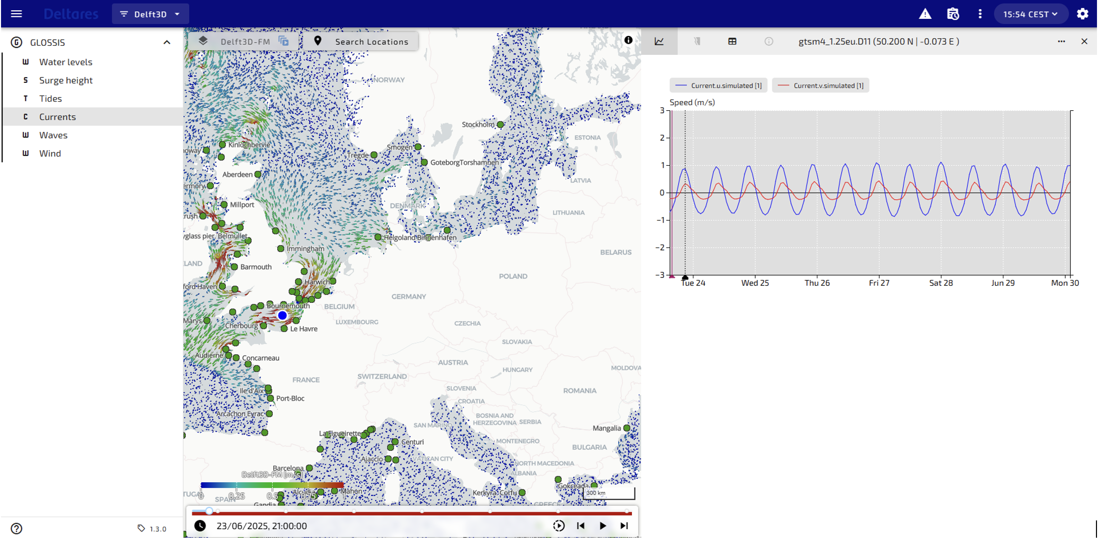 Figure 1 Example of GLOSSIS dashboard based on Delft-FEWS WebOC , the global total water level forecast includes both tide and storm surge (upper panel); Surface currents forecast near the English Channel (lower panel): spatial animation of surface currents forecasts (Left ), scalar time series of current speed at selected location (blue dot on spatial map, right )