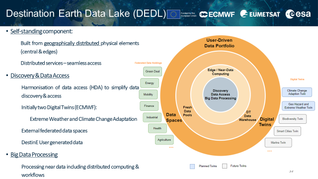 EUMETSATEuropean Organisation for the Exploitation of Meteorological is responsible for the DestinE Data Lake (DEDL)Self-standing DestinE system component, interfacing with the More component, aiming to bring to users’ fingertips, data of unprecedented scale and diversity as well as a dynamic and flexible portfolio of big data processing services and workflows executed near these vast volumes of data.
