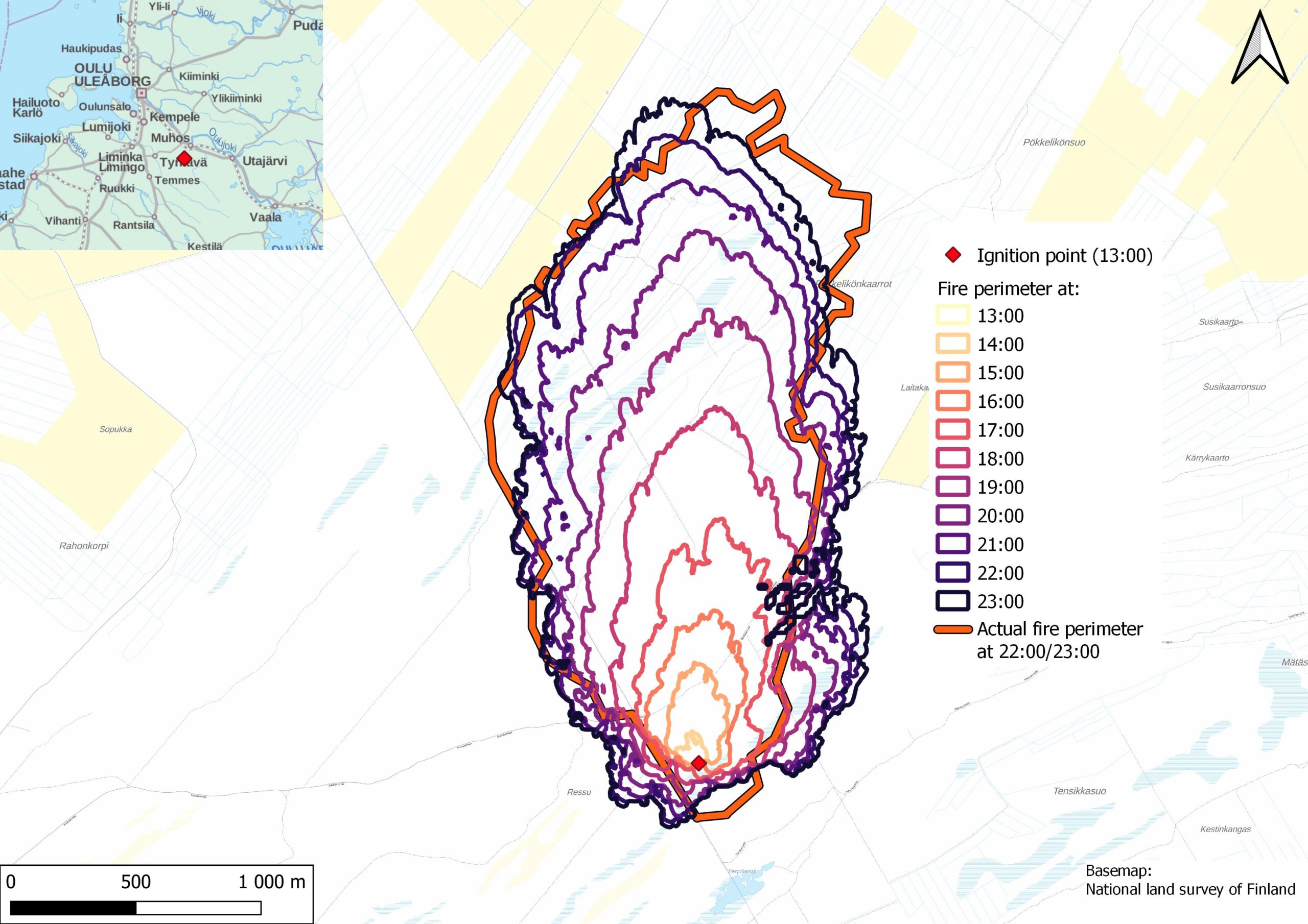 Simulation of forest fire spread in Muhos, Finland on 29.6.2020, where the fire burned an 250 hectare area within a 10 hour period. Red curve shows burned area at 22-23 EET and thin coloured lines show fire spread at one hour interval after ignition simulated by Prometheus. Credit: FMI