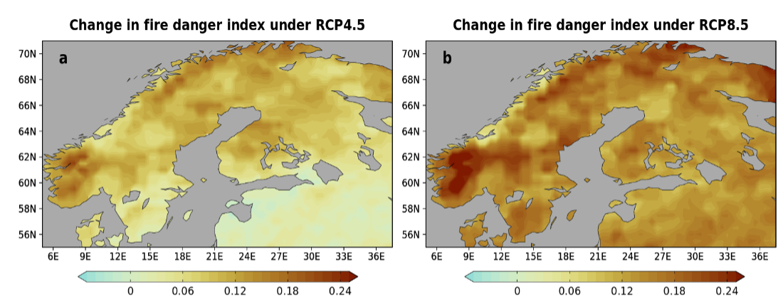 Projected change in fire danger index in Fennoscandia during summer months (JJA) from the period 1981–2010 to 2071–2100 under the RCP4.5 and RCP8.5 climate change scenarios as simulated using the Spitfire model. The model was driven with CORDEX data based on the global driver model CanESM2. Credit: FMI